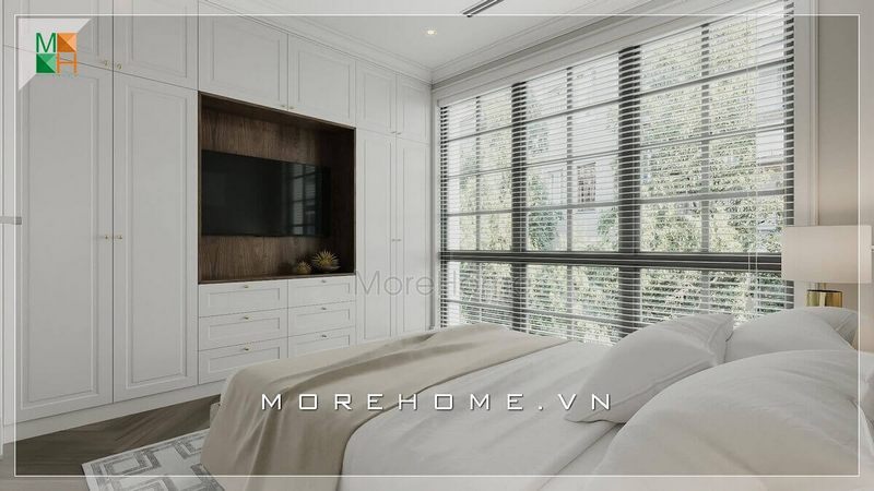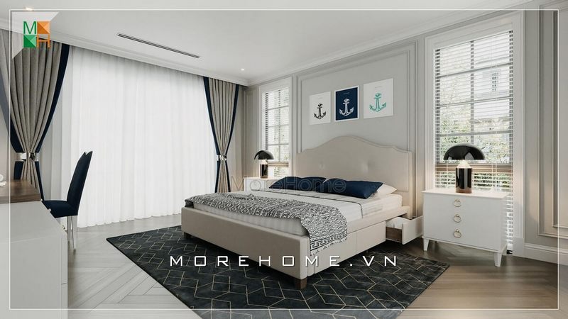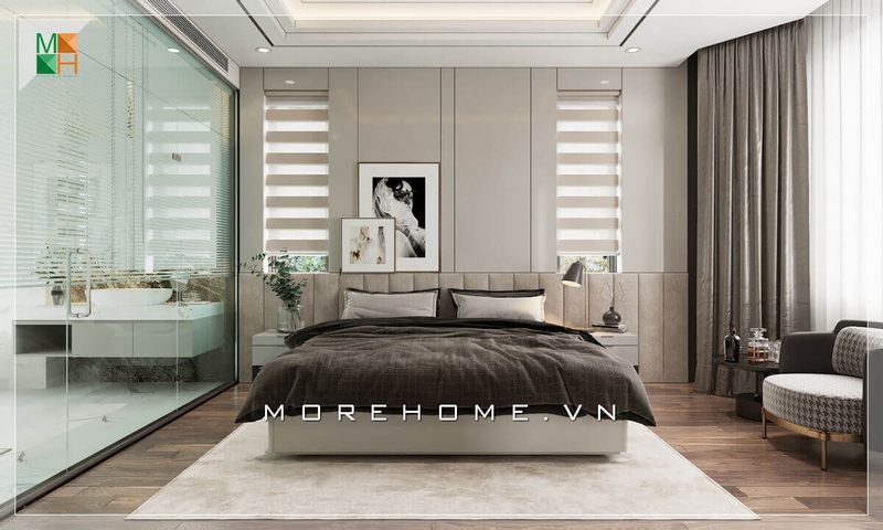 Giường ngủ hiện đại bọc da đầu giường có ngăn kéo dưới gầm tiện lợi độc đáo và sáng tạo được chọn làm tâm điểm của phòng ngủ biệt thự