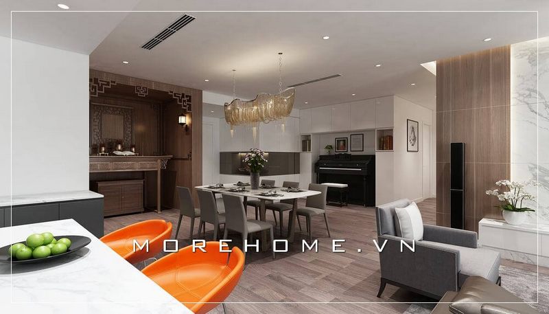 Xu hướng thiết kế mở điển hình với cách phân chia phòng khách liền phòng ăn không vách ngăn đã tạo nên sự thông thoáng, độc đáo đặc biệt với các căn hộ chung cư hiện đại.
