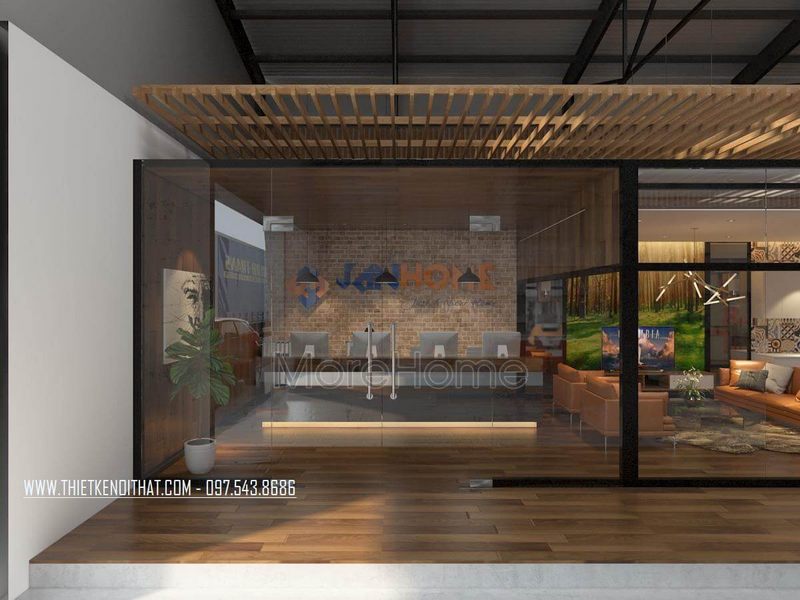 Mẫu thiết kế văn phòng showroom nội thất JANHOME hiện đại sử dụng kính cường lực ngăn cách giữa các không gian, tạo sự gần gũi, tiện nghi