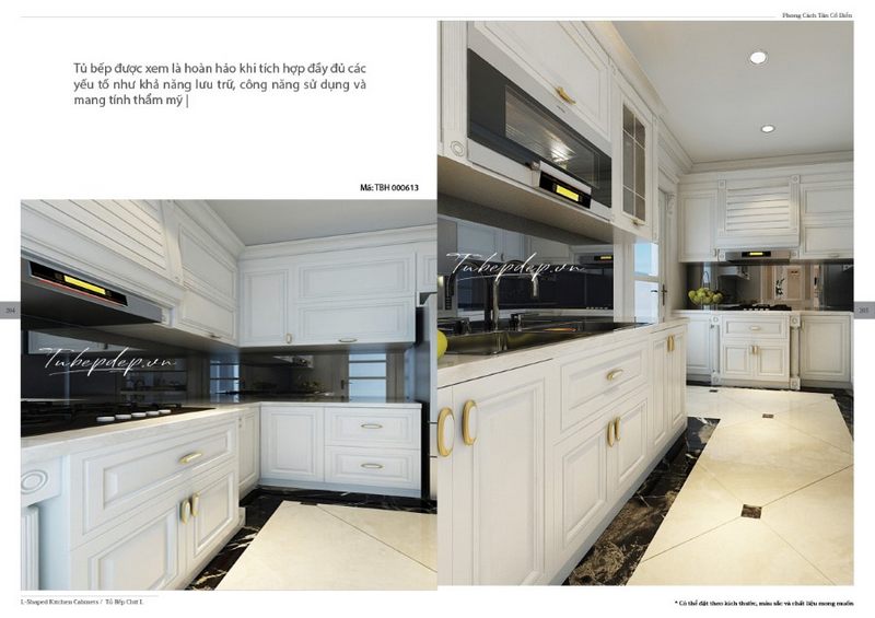 Thiết kế phòng bếp lấy 2 màu đen trắng là chủ đạo, sự đối lập màu sắc giữa tủ bếp màu trắng tân cổ điển với kính ốp bếp màu đen cho không gian rộng rãi và có chiều sâu hơn
