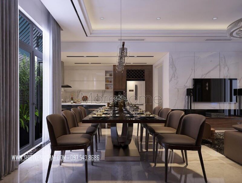 . Mẫu bàn ghế ăn dài hiện đại với thiết kế khung gỗ cao cấp, ốp làm bằng da lì màu đen, và vách bàn ăn được thiết kế độc đáo, mang lại cảm giác ấm cúng cho không gian gia đình.