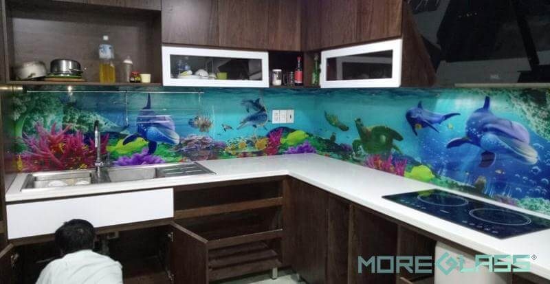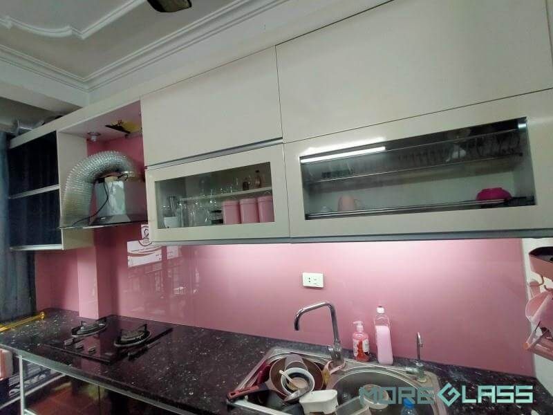 Mẫu kính ốp bếp màu hồng lãng mạn có khả năng tạo ra cảm giác thư giãn, thoải mái, phù hợp với không gian phòng bếp hiện đại. Đây là một trong những tông màu có khả năng khơi gợi cảm xúc.