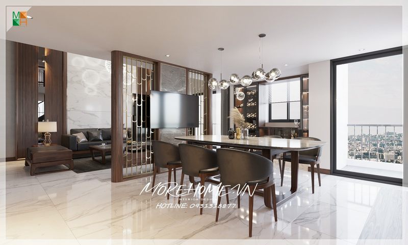 Mẫu thiết kế phòng ăn có bộ bàn ăn 6 ghế bằng gỗ tự nhiên cao cấp và mặt bàn đá nhân tạo chân vuông độc đáo, tạo nên sự sang trọng cho không gian.