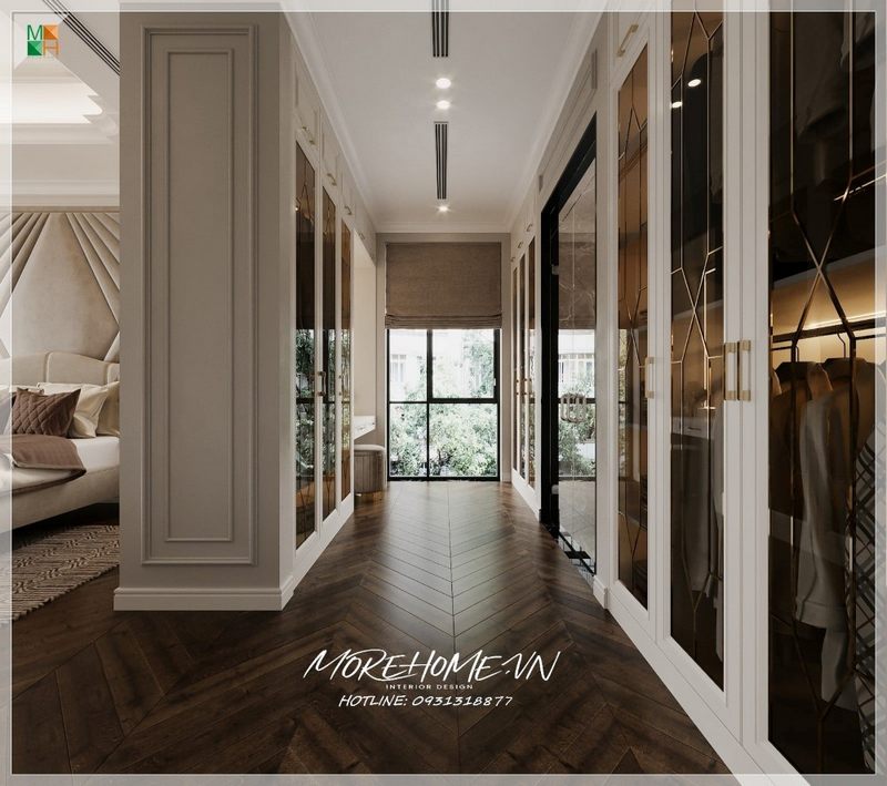 . Phòng ngủ master pethouse, biệt thự, nhà phố có diện tích lớn có thể được sử dụng một hệ thống phòng thay đồ với tủ quần áo để chia ra khu vực thay đồ và khu vực nghỉ ngơi, như trong mẫu thiết kế phòng ngủ.